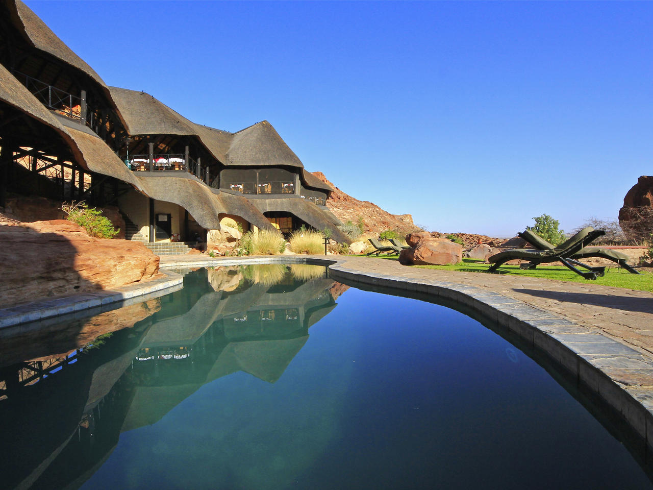 GocheGanas is circa 29 km ten zuidoosten van Windhoek gelegen, bovenop een heuvel in een privé wildreservaat van 6000 hectare waar zo'n 1600 dieren (25 soorten) leven. Tijdens game drives, fietstochten en wandelingen kunt u neushoorns, zebra’s, giraffen, oryx, verschillende soorten antilopen en cheeta’s tegenkomen. Ook interessante kleine diersoorten zoals honingdassen, bergmarmotten en stekelvarkens leven in het reservaat. GocheGanas is een heerlijk luxe begin of einde van uw reis door Namibië. De lodge heeft 16 luxe rietbedekte chalets die uitzicht bieden op het reservaat. Alle kamers zijn verschillend ingericht maar voorzien van airconditioning, minibar, televisie, DVD/CD speler en een ruime badkamer met bad, douche en toilet. Tien chalets hebben een buitendouche. Eén chalet is geschikt voor een gezin en heeft twee aparte slaapkamers met elk een eigen badkamer. GocheGanas heeft een groot en modern Wellness Village, met 11 ruimtes voor massages, fitness, sauna en een verwarmd binnenzwembad. Buiten is er ook een groot zwembad met ligstoelen en parasols. Een restaurant en een aparte bar completeren de faciliteiten van de lodge. Ter plaatse kunt u activiteiten of wellness behandelingen reserveren, maar indien u verzekerd wilt zijn van beschikbaarheid, geef dan uw wensen bij het boeken van deze lodge door.
