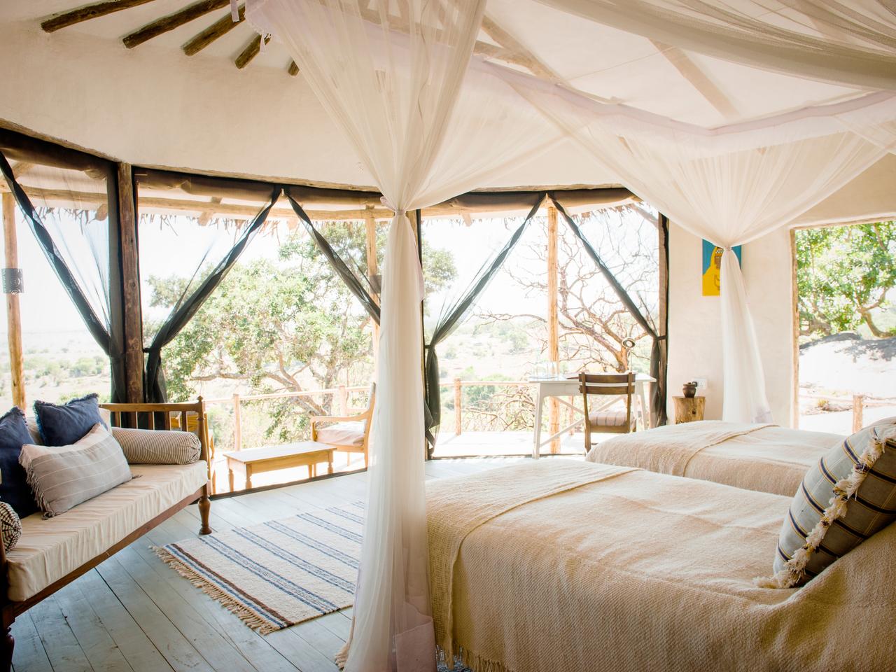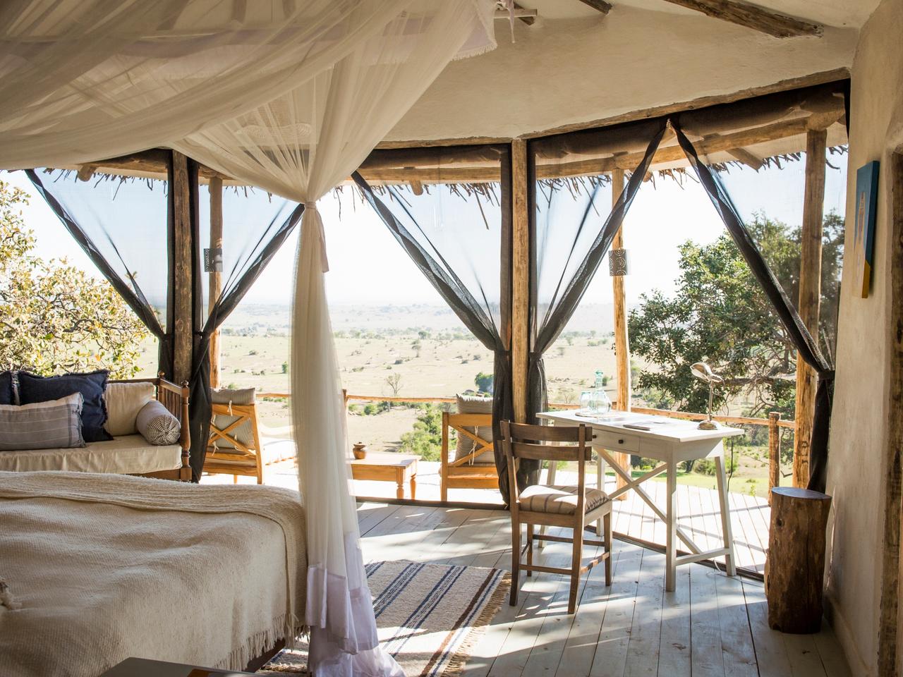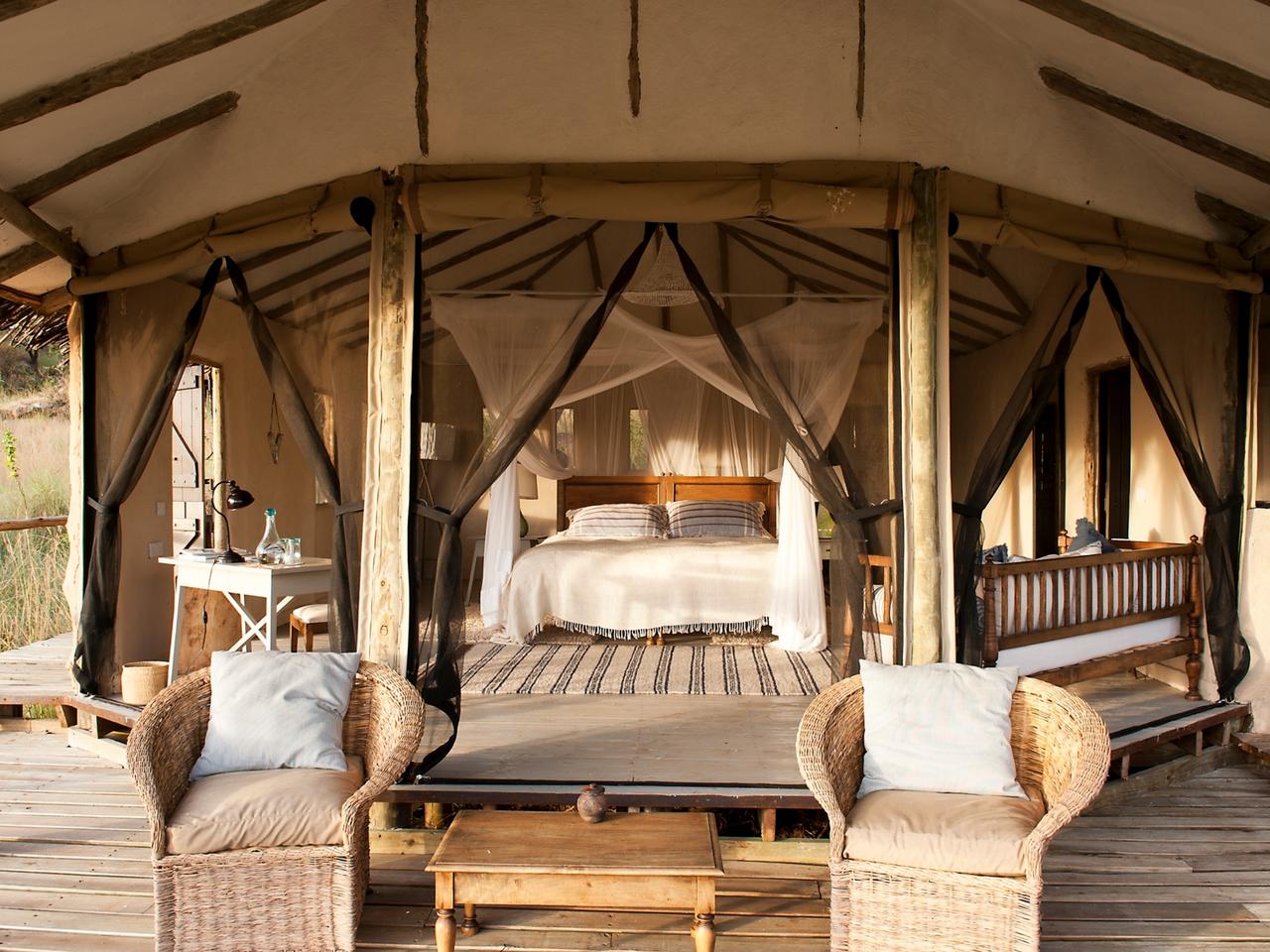 Er zijn twaalf stenen cottages op verhoogde, houten vlonders, 3 van de kamers hebben een aangrenzende kamer met twee bedden voor kinderen. Elke kamer heeft een “open voorkant”, met slechts muskietengaas, dus onbelemmerd uitzicht over de savanne. De bedden hebben muskietennetten en er zijn canvas luiken die voor het gaas geritst kunnen worden. De badkamers hebben een ruime douche met warm en koud stromend water (d.m.v. zonne-energie), en een doorspoel toilet. Op de privé veranda een staat een comfortabel dagbed en stoelen om te relaxen en te genieten van het indrukwekkende uitzicht.