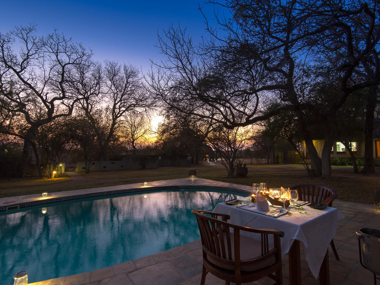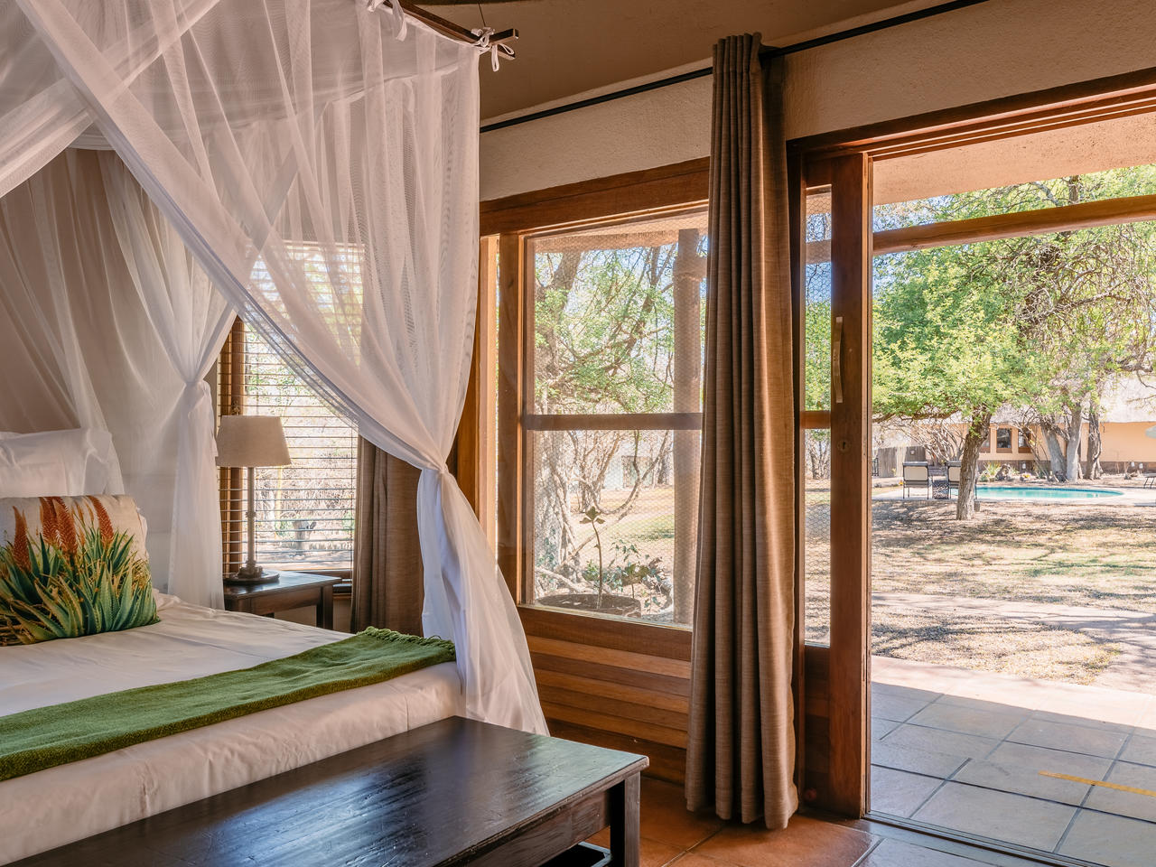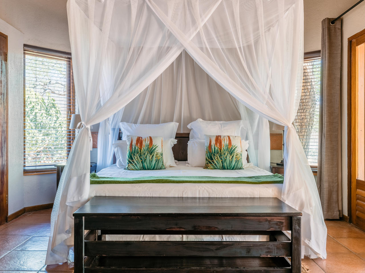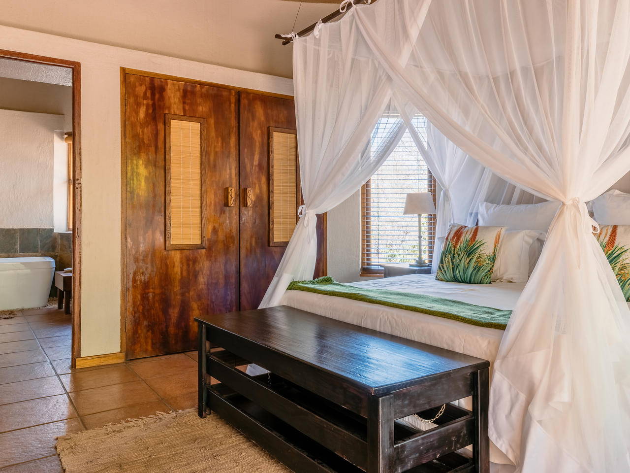 Er zijn vier luxe en ruime suites met een aparte lounge, slaapkamer en twee badkamers. De lounge kan eventueel aangepast worden naar een extra slaapkamer voor een gezin met kleine kinderen. De suites liggen los van elkaar en kijken allemaal uit op het zwembad in het midden van de tuin. Gasten ontmoeten elkaar in het hoofdgebouw voor de maaltijden en een drankje in de bar. Op een mooie dag kan het diner ook in de sfeervol verlichte ‘boma’ worden geserveerd bij een knapperend kampvuur.