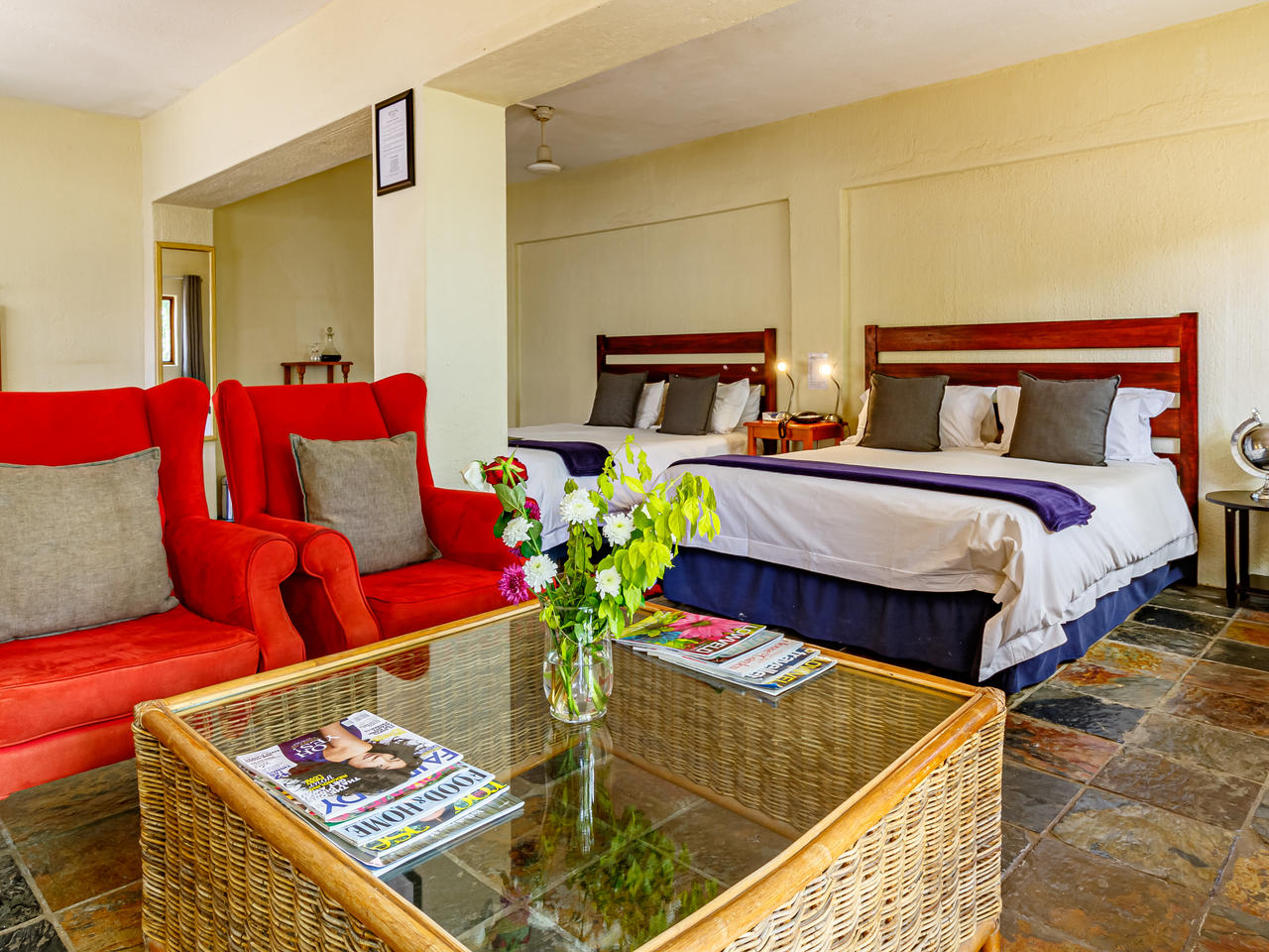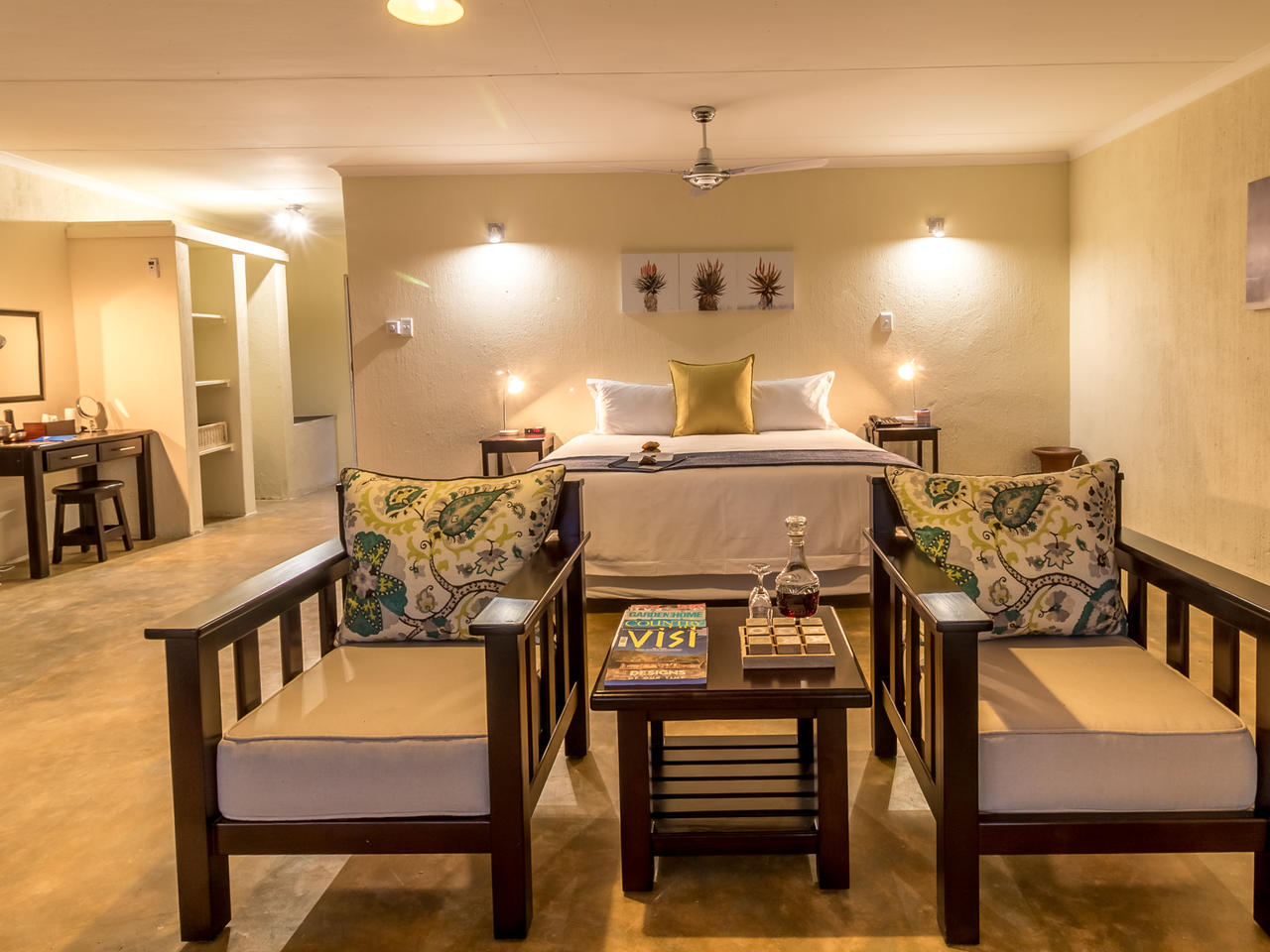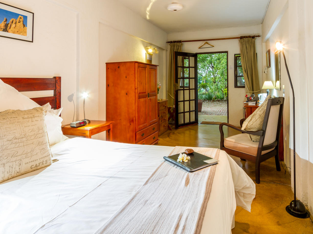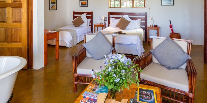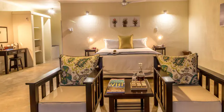 De 20 individueel ingerichte kamers worden omringd door 10 hectare landgoed met veel bomen, bloemen en talrijke vogelsoorten. De superior en de met rietbedekte herberg, liggen in de schaduw van de prachtige bomen en hebben adembenemend uitzicht over de vallei. Elke kamer heeft een eigen ingang en veranda, een volledig ingerichte badkamer. De garden suites liggen iets verder van het hoofdgebouw, net als de twee hillside suites, die samen een eigen zwembadje delen. Zowel de garden suite als de hillside suites, hebben naast een een badkamer binnen, elke een buitendouche.