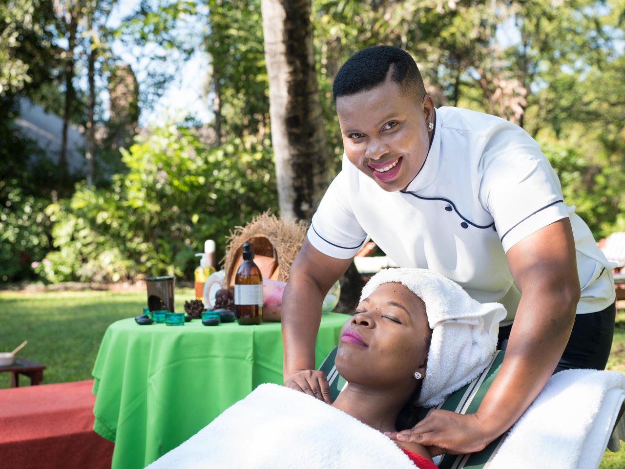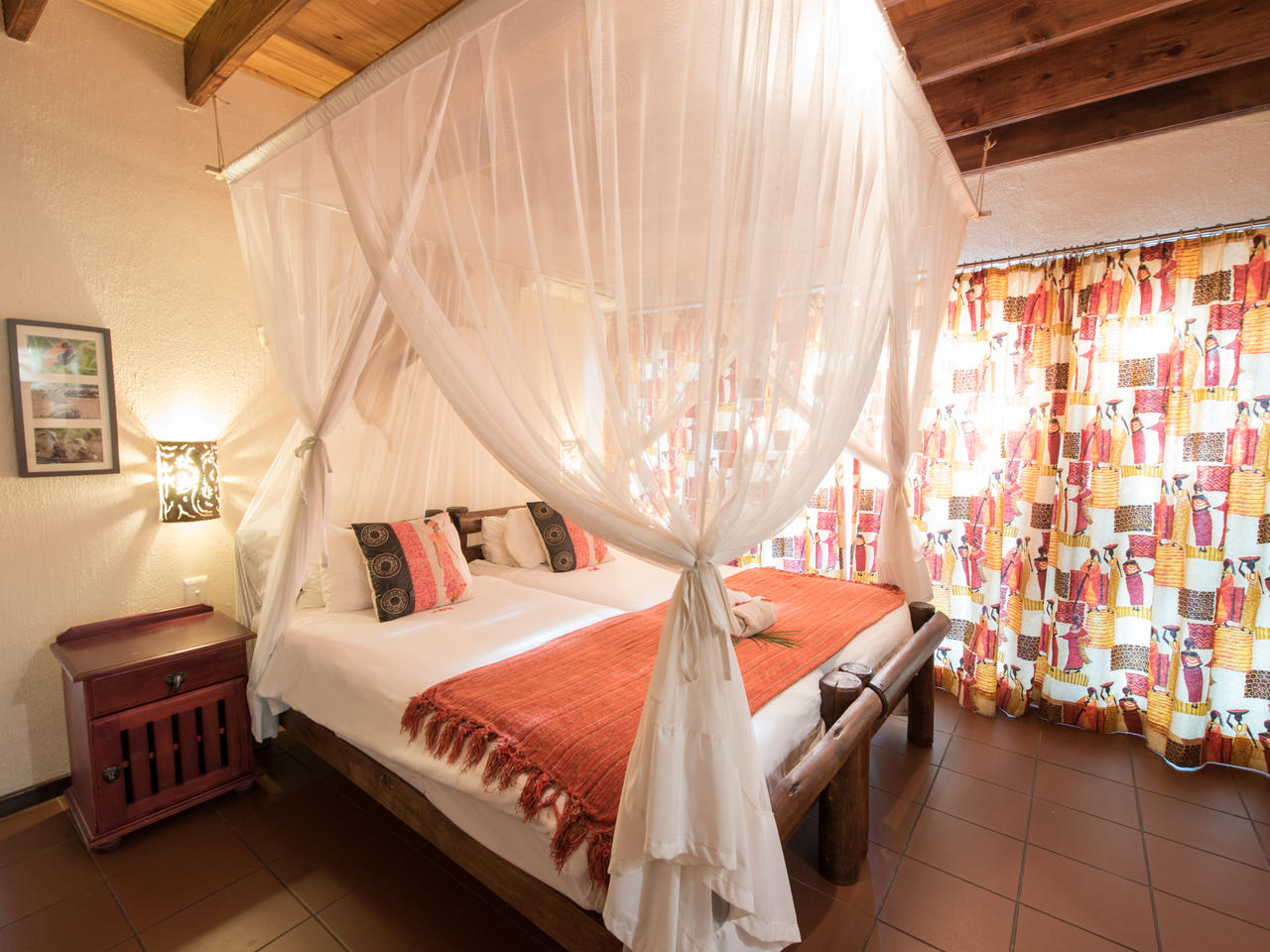 Alle kamers hebben twee aparte bedden, een eigen badkamer met douche, toilet, koelkast, koffie- en theefaciliteiten, wekker, haardroger, airconditioning, een eigen veranda en een eigen parkeerplaats. De rondavels liggen te midden van tropische tuinen, sommige met uitzicht op de dam
