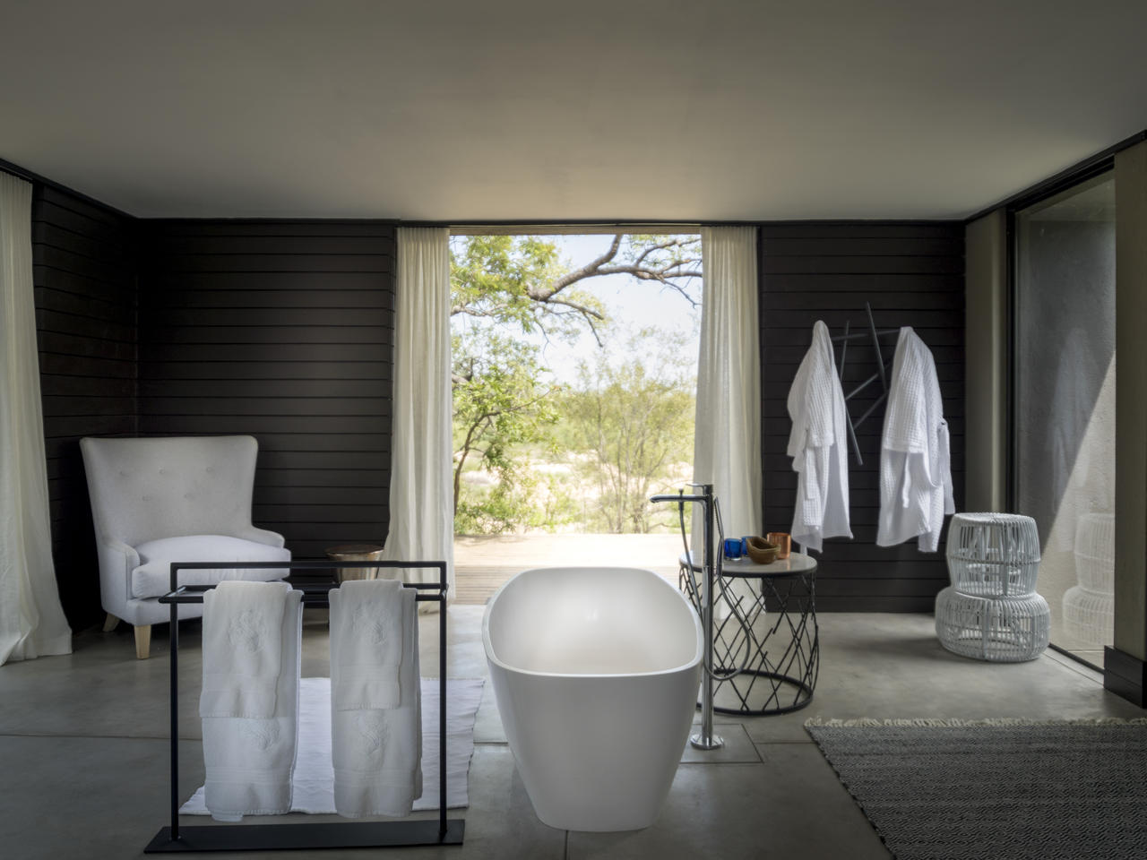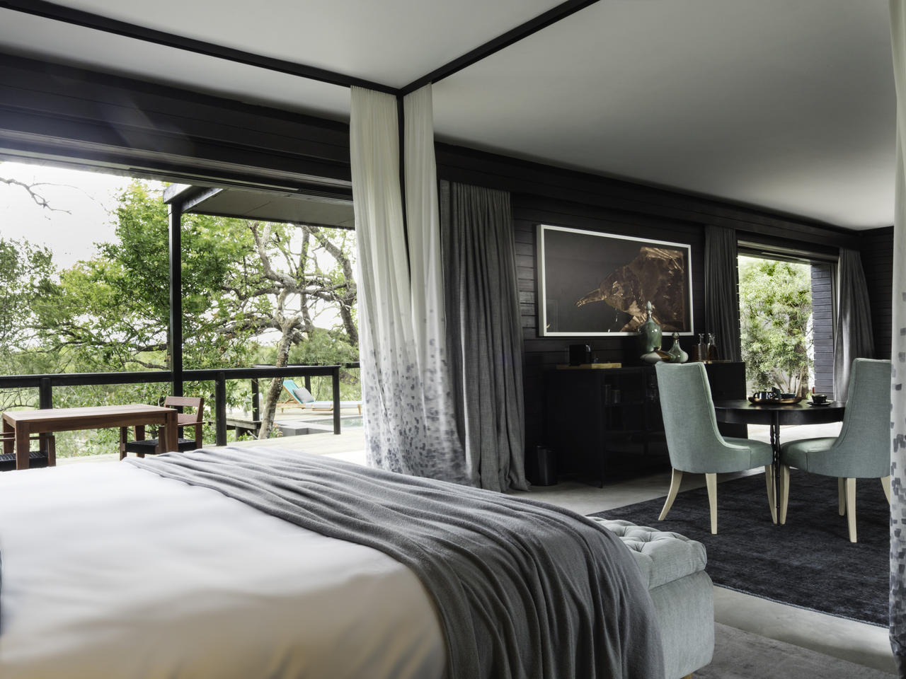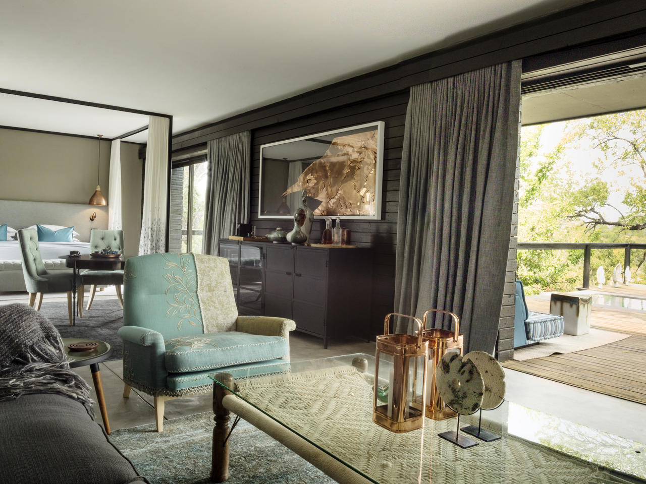 Deze winterharde, groenblijvende boom die vaak onopgemerkt blijft in de struik, behalve de zwarte neushoorn die houdt van bladeren, geeft zijn geest aan deze suite. Terwijl het verhaal van de boom een voelbaar thema is, houd je ogen open om te proberen het te vinden wanneer je op een game drive.De zachte blauw-grijze tinten van deze suite, geïnspireerd op de Blue Guarri, creëren een oase van rust en rust. Deze energie stroomt naadloos door de ruimte. De kunst op maat is een wonder om te zien en de koperen gloed zorgt voor warmte en comfort.